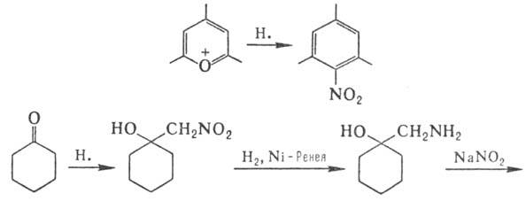 При взаимодействии нитрометана с пирилиевыми солями образуются ароматич. нитросоед.; с помощью нитрометана происходит расширение цикла в циклоалканонах, напр.:
