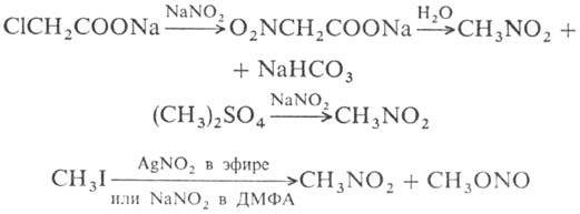 В пром-сти нитрометан получают деструктивным нитрованием низших алканов (напр., пропана) 50-70%-ной HNO3 при 400-700 °С в проточном реакторе (трубка Ni-Cr, время контакта до 2 с). Из реакц. смеси фракционированием выделяют нитрометан (~ 10%) и нитропарафины С2-С3; исходный пропан возвращают в реактор. В лаборатории нитрометан получают по р-циям: