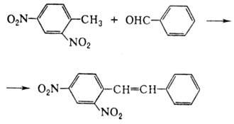 Хим. св-ва динитропроизводных обусловлены влиянием двух нитрогрупп на метильную группу, вследствие чего последняя способна замещать атомы Н на др. группы, напр. при взаимод. с бензальдегидом: