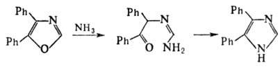 Оксазол представляет собой 6p-электронную аро-матич. систему. Оксазол и его замещенные устойчивы к щелочам, с сильными к-тами образуют по атому N непрочные соли, под действием окисли телей (КМпО4, К2Сг2О7) и горячих неорг. к-т раскрывают цикл с образованием a-ациламинокарбониль-ных соединений. Оксазол с трудом вступает в р-ции электроф. замещения; для его замещенных, содержащих электроно-донорные заместители в положении 2, р-ция идет по положениям 5 и, труднее, 4. Незамещенные по положению 2 оксазолы и 2-алкил(арил)замещенные под действием NH3 или H2S претерпевают размыкание кольца с послед. рециклизацией в имидазолы или тиазолы соотв., напр.: