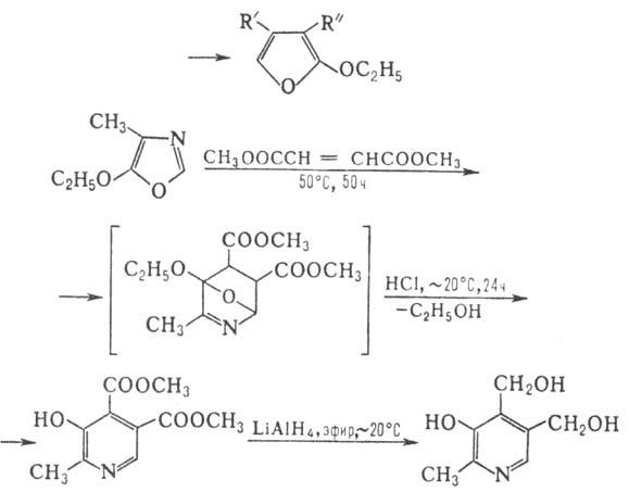 С соед., содержащими активир. кратную связь, оксазол и его замещенные вступают в диеновый синтез с образованием производных фурана или пиридина, напр.: