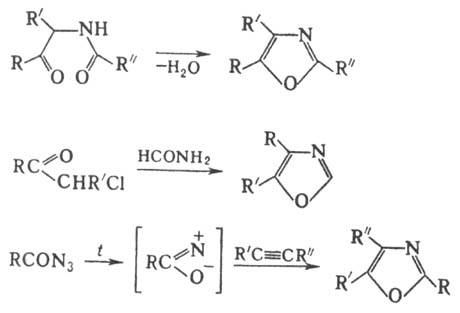 Оксазол получают конденсацией бромпировиноградной к-ты с формамидом с послед. декарбоксилированием образующейся оксазол-4-карбоновой к-ты; замещенные оксазолы-по след. р-циям: