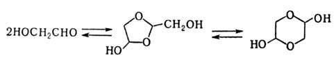 В твердом состоянии 1,2-гидроксиальдегиды, способные к енолизации, димеризуются; в р-ре наблюдается равновесие между пяти- и шестичленными циклич. димерами: