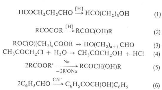 Оксиальдегиды и оксикетоны получают восстановлением дикарбонильных соед. (р-ции 1, 2) или эфиров дикарбоновых к-т (3), гидролизом галогенсодержащих карбонильных соед. (4), ацилоиновой (5), бензоиновой (6) или альдольной конденсацией (7):
