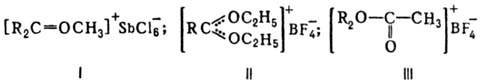 Третичные карбоксониевые соли получают: алкилирова-нием карбонильных соед. третичными оксониевыми соединениями или алкилгалогенидами в присут. безводного AgBF4, а также действием BF3 или SbCl5 на ортоэфиры:
