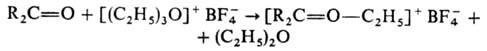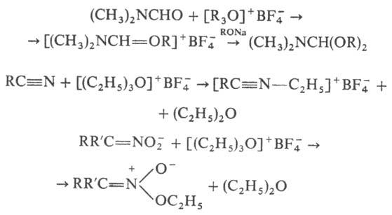 С помощью третичных алифатических оксониевых соединений синтезированы чрезвычайно реакционноспособные ацетали амидов к-т и лактамов, нитрилиевые соли (последние м. б. восстановлены до вторичных аминов) и эфиры нитроновых к-т, напр.: