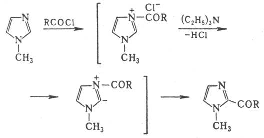 Широкое применение в орг. синтезе находит триэтиламин. Так, ацилирование 1-метилимидазола в его присут. протекает в положение 2. Роль триэтиламина заключается в ионизации связи С-2—Н в катионе 1-ацил-3-метилимидазо-лия. что обеспечивает перенос ацильной группы к атому С-2: