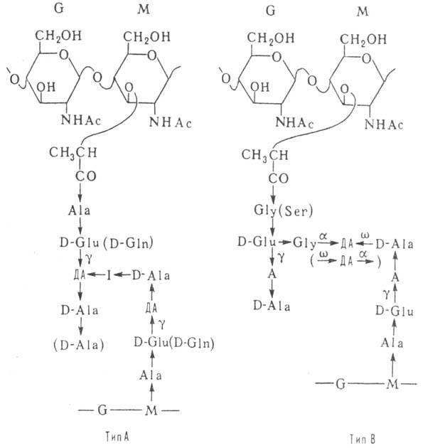Углеводные цепи пептидогликанов, выделенных из разл. бактерий, отличаются незначительно. Так, аминогруппы остатков мурамовой к-ты в нек-рых пептидогликанах могут быть свободны, ацилирова-ны гликолевой к-той или образуют амидную связь с соседней карбоксильной группой; изредка встречается аналог мурамовой к-ты, имеющий D-манно-конфигурацию. Аминогруппы остатков глюкозамина также иногда свободны; отдельные гидроксильные группы полимера м. б. ацетилирова-ны или фосфорилированы. Напротив, пептидные фрагменты пептидогликанов характеризуются очень сильной изменчивостью: известно ок. 100 разл. структур пептидных участков, общими чертами к-рых является обязательное наличие остатков аминокислот D-ряда и присутствие редких диаминокислот (L-гидроксилизина, L-орнитина, мезо-диаминопимелиновой к-ты и др.). В большинстве пептидогликанов, как показано на схеме, поперечные сшивки построены по типу А (с дополнит. пептидным мостиком I в грамположит. бактериях), реже встречаются сшивки типа В.