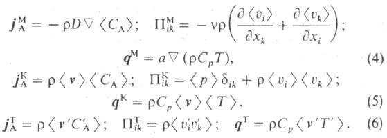 Составляющие плотностей потоков массы, импульса и теплоты в ур-ниях (1)-(3) описываются выражениями (4)-при молекулярном, (5)-при конвективном и (6)-при турбулентном механизмах переноса: