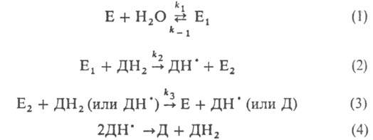 E, E1 и E2- соотв. исходная пероксидаза и ее окисленные формы; ДН2, ДН и Д-соотв. исходный, полуокисленный и окисленный субстраты; k-константа скорости р-ции.