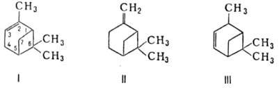 ПИНЕНЫ, мол. м. 136,23. Известны три изомера, отличающиеся положением двойной связи: 2-пинен, или a-пинен (2,6,6-триметилбицикло[3.1.1]гепт-2-ен; ф-ла I), 2(10)-пинен, или b-пинен (2-метилен-6,6-диметилбицикло[3.1.1]гептан, нопинен; II), и d-пинен (2,6,6-триметилбицикло[3.1.1]гепт-3-ен; III).