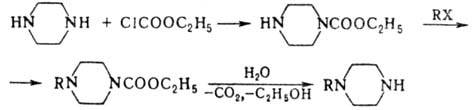 -45,63 кДж/моль; m 4,90· 10 -30 Кл·м. Пиперазин обладает св-вами вторичных алифатич. аминов. Р-ции алкилирования (в т.ч. кватернизация), ацилирования, нитрозирования, хлорирования и др. идут обычно сразу по обоим атомам N. Для получения монозамещенных пиперазина используют блокирование одного атома N легко удаляемым заместителем, напр.: