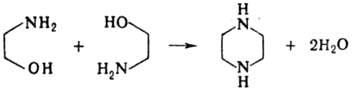 Получают пиперазин циклизацией этилендиамина и полиэтилен-полиаминов при 175-2000C в присут. Ni, Со, Cu или Pt, а также дегидратацией моно-, ди- и триэтаноламина или их смесей с алкилендиаминами в присут. ZnCl2, H3PO4, Al2O3 или Ni на Al2O3 при 150-3000C и давлении (H2 + NH3) 10-25 МПа, напр.: