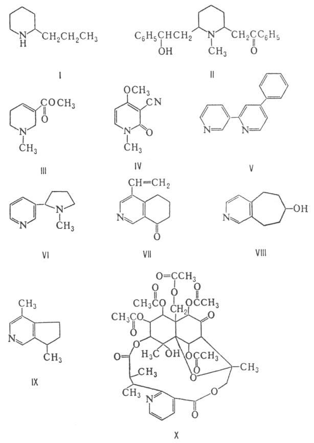 Пиридиновые алкалоиды третьей группы выделены из растений родов горечавка (Gentiana), мытник (Pedicularis), коровяк (Verbascum), валериана (Valeriana), актинидия (Actinidia), подорожник (Plantago) и др. Алкалоиды этой группы имеют в своей структуре пиридиновое кольцо, конденсированное с пяти-, шести- или семичленным циклом, как, напр., у генцианина (VII), педикулинина (VIII) и актинидина (IX).