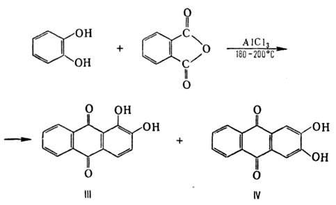 Сплавление пирокатехина с фталевым ангидридом приводит к образованию красителей-ализарина (ф-ла III) и гистазарина (IV):