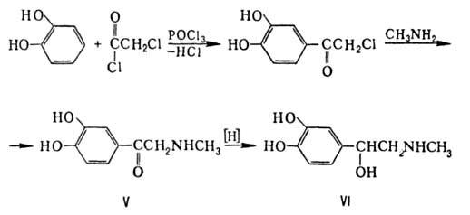 Изобутиленом пирокатехин легко алкилируется по р-ции Фриделя-Крафтса с образованием смеси 3- и 4- трет-бутилпирокате-хинов. С хлорангидридом хлоруксусной к-ты в присут. POCl3 или AlCl3 и послед, действием CH3NH2 превращ. в адреналон (V), восстановлением к-рого получают адреналин (VI):