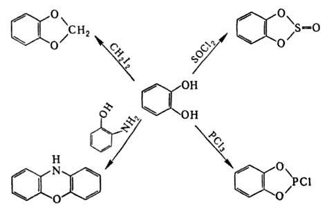 Пирокатехин образует разл. производные, вступая в р-ции с CH2I2, фосгеном, хлорангидридами K-T, аминофенолом и др. соед., напр.: