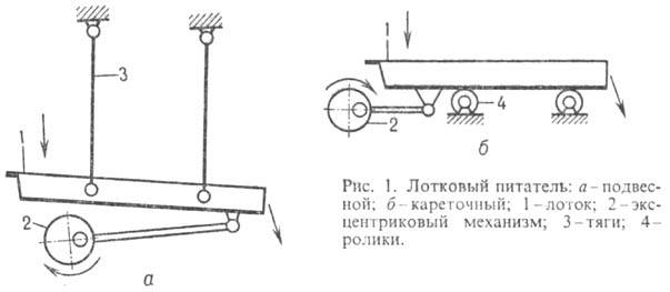 Лотковые (качающиеся) питатели. В подвесных питателях лоток подвешивается на тягах (рис. 1,а)и получает колебат. движение от эксцентрикового механизма. Такие устройства используют преим. для подачи легких сыпучих материалов (напр., соды) с насыпной плотн. до 1000 кг/м3 и размером кусков до 500 мм. Кареточные питатели имеют аналогичный привод, но лоток установлен на роликовые опоры (рис. 1,б); их применяют для подачи абразивных материалов с насыпной плотн. до 2500 кг/м3 и размером кусков до 200 мм. Производительность лотковых питателей 8-50 т/ч, мощность электродвигателя 1,5-4,5 кВт.