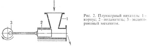 Плунжерные питатели (рис. 2) осуществляют перемещение и подачу материалов за счет поступат. движения т. наз. подавателя. Изменяя его ход, можно регулировать производительность питателей (до 5 м3/ч).