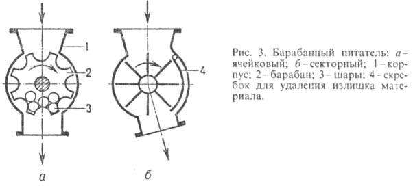 Барабанные питатели чаще всего бывают ячейковые (рис. 3,а) или секторные (рис. 3,6). При вращении барабана (частота до 5с-1) его ячейки (секции) заполняются материалом, а при повороте на 180° разгружаются. Число ячеек 3-12. Для улучшения разгрузки внутрь барабана иногда закладывают шары или устанавливают вибровозбудители, предупреждающие также свободообразование в бункерах. Производительность питателей (0,05-6 м3/ч) находят по ф-ле: