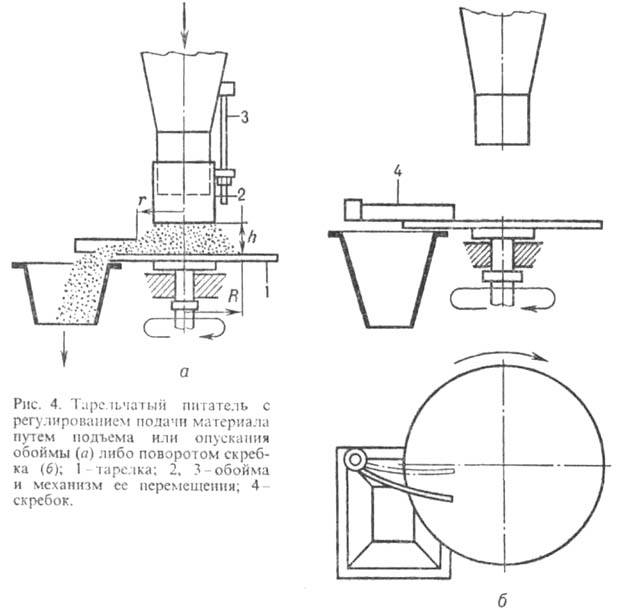 Тарельчатые (дисковые) питатели изготовляют в зависимости от условий применения в подвесном или опорном исполнении с подвижной обоймой (рис. 4,a) либо с поворотным скребком (рис. 4,б). Производительность питателей (до 15 м3/ч) находят по ф-ле: