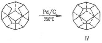 Призман (И) разлагается при 90°С; кубан (III)-при 200°С; адамантан-ок. 660 °С. Структуры октаэдра и особенно икосаэдра наиб. характерны для бороводородов В6Н62- и С2В4Н6, а также для карборанов. Осуществлен 20-стадий-ный синтез незамещенного додекаэдрана (IV) и его 1,16-диметильного производного. Результаты рентгеноструктур-ного анализа и св-ва полученных соед. подтвердили данные выполненных ранее расчетов о практич. отсутствии углового напряжения и высокой термич. устойчивости молекулы. Последнее подтверждается также мягкими условиями дегидрирования при образовании последней связи С—С: