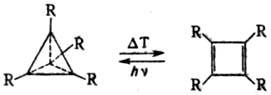 Устойчивость полиэдрических соединений зависит от энергии напряжения (см. Напряжение молекул), к-рая колеблется в широком диапазоне, а также от заместителей (лигандов) у атомов в вершинах полиэдров; как правило, объемные и электроноакцеп-торные группы повышают кинетич. устойчивость полиэдрических соединений. В то же время, напр., С4[С(СН3)3]4 при плавлении превращ. в термодинамически более устойчивый валентный изомер -производное циклобутадиена, при фотохим. возбуждении последнего происходит обратная р-ция: