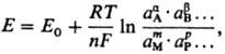 где Е0 стандартный потенциал, R-газовая постоянная, Т-абс. т-ра, F-постоянная Фарадея, n-число электронов, участвующих в р-ции, a, b, ..., т, р ...-стехиометрич. коэф. при компонентах р-ции А, В, ..., М, Р (к-рыми м.б. ионы и молекулы в жидкой, твердой или газовой фазе). Активности твердых и газообразных компонентов и р-рителей принимают за единицу.