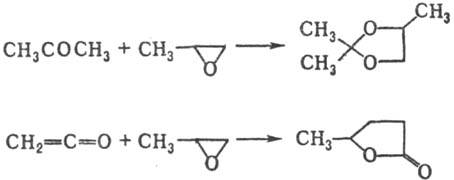 При взаимод. с карбоновыми к-тами в присут. солей щелочных металлов пропиленоксид превращ. в гидроксизамещенные сложные эфиры; при взаимод. с галогеноводородами дает соответствующие галогенгидрины, с NH3-моно-, ди- или триизопропаноламины. Гидрирование в присут. N1 приводит к 1-пропанолу, восстановление амальгамой Na, Na в жидком NH3 или LiAlH4 - к изопропанолу. С альдегидами и кетонами пропиленоксид образует циклич. ацетали, с кетенами g-лактоны, напр.:
