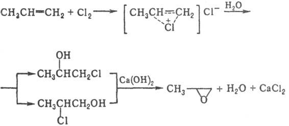 Пропилен и С12 смешивают в эквимолярных кол-вах с избытком Н2О (4-7-кратный); р-цию проводят при 35-40 °С, поддерживая концентрацию пропиленхлоргидрина не более 4-6% по массе для уменьшения кол-ва побочных продуктов-дихлорпропана и дихлорпропилового эфира. Избыток пропилена отделяют и возвращают в р-цию. На след. стадии при комнатной т-ре водный р-р смеси пропи-ленхлоргидринов обрабатывают избытком известкового молока-р-ра Са(ОН)2. Образующийся пропиленоксид отгоняют для предотвращения гидратации в гликоль. Недостаток процесса - использование С12 и образование больших кол-в разб. (5-6%) р-ра СаС12. Наиб. экономичная разновидность процесса - комбинирование с электролитич. произ-вом С12 и NaOH; при этом гидролиз пропиленхлоргидрина осуществ-ляют при 80 °С р-ром NaOH после электролиза, а образующийся р-р NaCl используют для растворения NaCl, направляемого на электролиз.