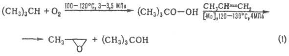 Пероксидный способ синтеза пропиленоксида основан на окислении олефинов надкислотами (Прилежаева реакция) и гидропероксидами изобутана и этилбензола. В первом варианте синтеза пропиленоксид образуется при взаимод. пропилена с надуксус-ной или надпропионовой к-той, получаемыми окислением ацетальдегида или пропионовой к-ты; соотв. этот вариант синтеза не находит широкого применения. Второй вариант синтеза осуществляют по схемам 1 и 2: