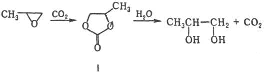 Пропиленоксид-один из наиб. распространенных оксидов олефинов (см. Олефинов оксиды). Для него характерны р-ции присоединения, обусловленные относит. легкостью размыкания цикла. Наиб. распространенная р-ция-гидратация с образованием пропиленгликоля. Побочные продукты ди-, три-и полигликоли. Гидратация пропиленоксида с использованием СО2 (120-160 °С, 0,5-4 МПа) протекает селективно с образованием монопропиленгликоля (кат.-четвертичные соли аммония и фосфония, третичные амины, галогениды щелочных металлов); промежуточно образуется пропиленкарбонат (I):