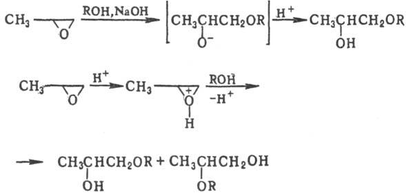 Со спиртами и фенолами пропиленоксид образует простые эфиры гликолей: в присут. щелочей-преим. первичный эфир, в при-сут. к-т-смесь первичного и вторичного эфиров в равном отношении: