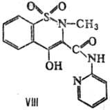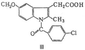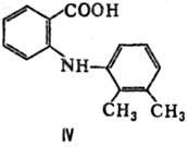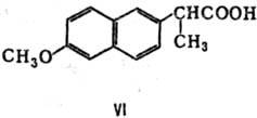 Нестероидные противовоспалительные средства широко применяют для лечения воспалительных и, прежде всего, ревматич. заболеваний. Большинство из них-производные карбоновых к-т (в частности, салициловой, антраниловой, индолилуксусной), а также пи-разолона и пиразолидина: ацетилсалициловая кислота, амидопирин и анальгин (см. Аналъгетические средства), бута-дион, ибупрофен, диклофенак натрия, индометацин (метин-дол, индацид, III), мефенамовая к-та (понстил, IV), флюр-бипрофен (V), напроксен (напросин, VI), кетопрофен (про-фенид, VII), пироксикам (пацил, VIII) и др. Эти в-ва обладают сходным спектром фармакологич. действия, вызывают противовоспалит., анальгезирующий и жаропонижающий эффекты. Механизм их действия связан в значит. степени с понижением активности ферментного комплекса, осуществляющего превращение арахидоновой к-ты в корот-коживущие пероксиды, из к-рых образуются эйкозаноиды (простагландины и др.), участвующие в патогенезе воспаления. Кроме того, нестероидные противовоспалительные средства препятствуют высвобождению лизосомальных ферментов, нарушают окислит. фосфорилирование в очаге воспаления и т.п.