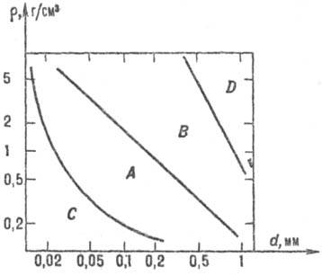 Пузыри в псевдоожиженном слое. Важнейшим св-вом псев-доожиженных слоев типа газ-твердое тело является образование в них пузырей (см. выше). От их размеров (обычно 3-30 см, но наблюдаются пузыри диаметром 0,5-0,7 м), общего числа, скоростей подъема зависит макросмешение газа и твердых частиц, а следовательно, и св-ва слоя как среды для осуществления хим.-технол. процессов. В пром. аппаратах, диаметры к-рых в ~5 раз и более превышают возможные размеры пузырей, картина их движения зависит от размера и плотности твердых частиц. По этим признакам ожижаемые материалы принято подразделять на группы А, B, С, D. Принадлежность сыпучих материалов к соответствующей группе приближенно устанавливают с помощью рис. 1 (по Джелдарду).