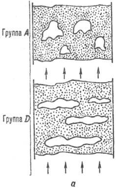 В слоях частиц группы А (рис. 2, а) пузыри зарождаются вблизи пов-сти газораспределит. решетки. По мере всплытия пузыри растут за счет натекания газа из плотной фазы и коалесценции. Одновременно наблюдаются акты разрушения пузырей, образования короткоживущих агломератов мелких пузырей, разделенных прослойками твердой фазы, к-рые вновь сливаются в один пузырь. На расстояниях 1,0-1,5 м от газораспределителя размеры пузырей стабилизируются. Однако при этом они начинают двигаться "цепочками", траектории к-рых изменяются. Масштабы плотных зон (т. наз. плотных пакетов) слоя, разделяющих полые неоднородности, увеличиваются. Скорости всплытия пузырей составляют 0,7-1,0 м/с, в то время как скорости ожижающего газа, отнесенные к полному сечению слоя, обычно не превышают 0,4 м/с. Доля газа, проходящего слой в виде пузырей, быстро возрастает при удалении от газораспределителя. Так, на расстоянии 0,2-0,5 м от решетки типа "пористая плита" в виде пузырей движется практически весь газ.