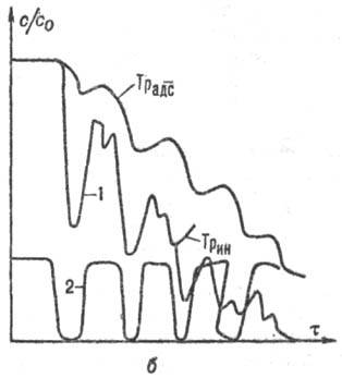 Рис. 2. Локальные кривые вымывания газов-трассёров (1) и кривые флуктуации плотности псевдоожиженного слоя (2): а-фрагменты двухмерного слоя (материалы групп А и D); б-инертный и адсорбирующийся трассёры, соотв. Tрин и Tрадс (материал группы A); в-инертный трассёр (материал группы D); с0, с-начальная и текущая концентрации трассёра; т-время.