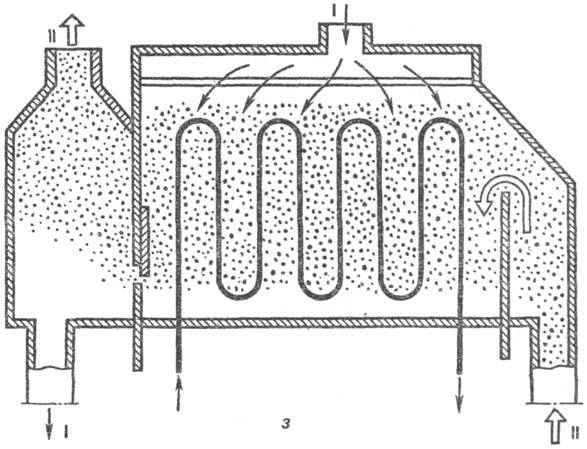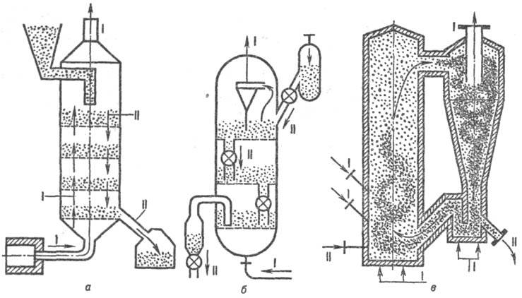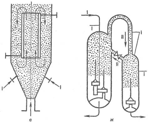 Рис. 4. Аппараты с псевдоожиженным слоем: а, б-секционир. противоточные с решетками провальными и снабженными переточными устройствами (адсорбция, обжиг); в - прямоточный с "быстрым" слоем и циркуляцией твердых частиц (обжиг, сжигание твердых топлив); г, д-с внутр. теплосьемными элементами и разл. способами газораспределения (реакторные процессы); е-с внутр. цирку-ляц. контуром (десублимация, реакторные процессы); ж - блок аппаратов с циркуляцией твердых частиц (крекинг, риформинг); з-с горизонтальным слоем (нагревание, охлаждение, сушка). I-поток сжижающего агента; II-поток частиц.