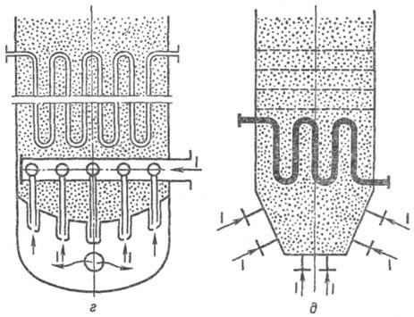При всем многообразии конструкций реакторов они представляют собой аппараты со свободно кипящими или секционированными с помощью провальных решеток слоями, к-рые снабжены теплообменными элементами; последние имеют газораспределители в виде перфорир. плит либо сопла, а также барботеры (рис. 4, г; в данном случае через решетку и барботер вводятся разл. газовые потоки). Нередко газ поступает в реактор через боковые штуцера (рис. 4, д и е). Функционируют аппараты, в к-рые одновременно вводятся газообразные и жидкие реагенты. Способы улучшения контактирования фаз, а также воздействия на перемешивание в реакторах принципиально те же, что и для систем газ-жидкость в колонных аппаратах. Благодаря текучести псевдоожиженного слоя такие каталитич. процессы вторичной переработки нефти, как крекинг и риформинг, проводят в совмещенных блоках реактор - регенератор (рис. 4, ж), что позволило перейти от полупериодич. про-из-ва к непрерывному. Подобные комбинации быстро распространились и на иные реакционные и массообменные процессы (напр., системы реактор-адсорбер).