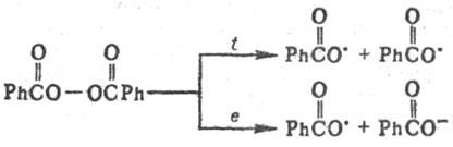 Характеризуются, как правило, большими значениями предэкспоненц. множителя в ур-нии Аррениуса и малыми энергиями активации Е. Включают по крайней мере две стадии - образование своб. радикалов и их гибель. Образование своб. радикалов происходит вследствие разрыва хим. связи, при к-ром на обоих фрагментах молекулы или на одном из них остается по одному неспаренному электрону, напр.:
