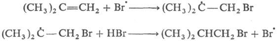 Свободнорадикальное присоединение НВr к несимметричным олефинам идет против правила Марковникова. Это объясняется тем, что в случае атаки такого олефина р-ция осуществляется по пути образования более стабильного радикала (увеличение числа алкильных заместителей при радикальном центре увеличивает стабильность радикала), поболее доступному атому С и па месту наиб. электронной плотности в молекуле, напр.: