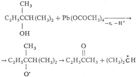 Внутримолекулярные реакции свободных радикалов. К этому типу р-ций относится фрагментация - распад радикала на молекулу и радикал с меньшей мол. массой. Р-ция характерна для мн. b-галоген-, b-тио-, a-гидроксиалкильных радикалов, а также для алкоксильных, ацилоксильных и нек-рых др. радикалов. Если фрагментация возможна по неск. направлениям (напр., при окислении несимметричных третичных спиртов), реализуется преим. то, к-рое приводит к более стабильному радикалу, напр.: