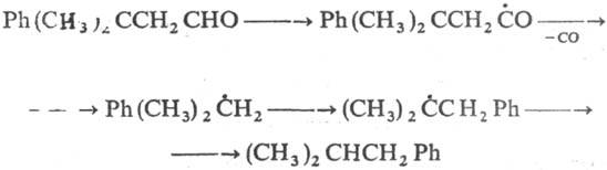 Т.к. в р-циях этого типа гемолизу подвергается связь, обычно расположенная в b-положении по отношению к неспаренному электрону, то такой процесс иногда наз. b-рас-щеплением или b-распадом. Ацильные радикалы, генерируемые из альдегидов, легко фрагментируют при т-ре выше 100°С на алкильные радикалы и СО.