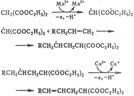 Окисление и восстановление свободных радикалов. Наиб. известно одноэлектронное окисление С-центрированных радикалов солями Сu(II), Co(III), Mn(III), Fe(III), Pb(IV), Се (IV). Р-ция осуществляется с высокими скоростями с переносом лиганда (С1, Вг, CN и др.), напр.: