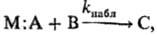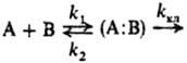 В случае, когда присутствуют только две формы, напр. М:А и М +·А-, реагирующие с В в двух простых параллельных стадиях с константами скорости k1 и k2 соотв., kнабл = ak1+ +(1—a)k2. Если константа равновесия перехода между двумя формами К=(1—a)/a, то вышеприведенное выражение принимает вид: kнабл=(k1 + Kk2)/(1+К), Обычно реакц. способность ионной пары выше, чем молекулы, и в случае, когда Kk2