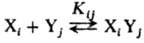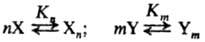 Для р-ции типа X+Y: продукты, где X и Y-соед., способные образовывать Н-связи: вода, спирты, амины, карбоновые к-ты и т. п., характерно участие гомоассоциатов Хn и Ym, а также гетероассоциатов XpYq. Во мн. случаях р-ции между мономерными формами X и Y практически отсутствуют. Имеют место след. равновесия: