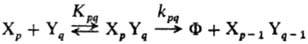 Согласно схеме, при наличии одного канала выхода скорость образования продукта Ф пропорциональна концентрации реакционноспособного ассоциата [ХрYq]: w = = d[Ф]/dt = kpq[ХрYq]; эта концентрация является ф-цией констант равновесия Кp, Кq, Кpq, Кi, Kj, Кij и стехиометрич. коэффициентов i,j,p,q. Наблюдаемый порядок реакции в растворах в этом случае зависит от соотношения стехиометрич. коэф., с к-рыми входят реагенты в каналы накопления и выхода. Энергия активации р-ции и предэкспоненц. множитель, формально найденные из аррениусовской температурной зависимости наблюдаемой константы скорости, являются сложными величинами, включающими термодинамич. характеристики равновесий образования вышеуказанных гомо- и гетероассоциатов.