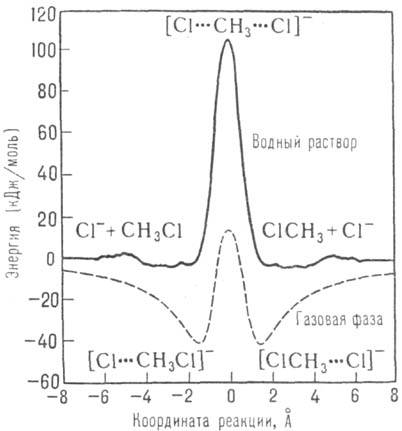 Прямое вычисление энергетич. профиля вдоль координаты р-ции на ПСЭ и последующий расчет константы скорости возможны с применением методов Монте-Карло и мол. динамики (см. Молекулярная динамика). Для упоминаемой р-ции SN2 при X, Y = С1 в газовой фазе ППЭ, полученная квантовохим. расчетом, имеет сложный профиль с двумя ямами, соответствующими образованию пред-и послереакционного комплексов. Для той же р-ции в воде профиль ПСЭ, полученный сочетанием квантовохим. расчета с методом Монте-Карло, имеет обычный вид кривой с потенц. барьером (см. рис.). Кол-во молекул р-рителя, к-рые следует учесть при расчете ПСЭ, велико. Как минимум, это молекулы, входящие в неск. ближайших коорди-нац. сфер хим. субстрата. Для р-ции SN2 в воде, напр., явно учитывали 250 молекул Н2О; полученное значение DG. = = 110 кДж/моль при 25 °С хорошо согласуется с экспериментом. Наконец, применение методов мол. динамики позволяет выйти за рамки теории активир. комплекса, рассчитав трансмиссионный множитель х в выражении для константы скорости.