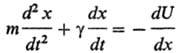 где x-динамич. переменная (обобщенная координата), m-связанная с ней масса. Первыми в правой и левой частях этого ур-ния стоят обычные ньютоновские члены: кинематич. член, пропорциональный ускорению, и регулярная сила [U(x)-потенц. энергия]. Второй член в левой части-сила трения, к-рая пропорциональна скорости dx/dt (g-коэф. трения); она описывает диссипацию энергии вследствие взаимод. координаты х со средой. Второй член в правой части-случайная сила-описывает нерегулярное воздействие среды на переменную х (при моделировании реакций в растворах она обусловливает термич. активацию субстрата, необходимую для преодоления потенц. барьера). Сила трения и случайная сила связаны таким образом, что их комбинир. воздействие обеспечивает установление в системе больцмановского распределения спустя время, превышающее период релаксации переменной х.
