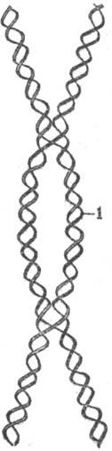 Схема спаривания двух гомологичных спиралей (одна из них обозначена жирной линией, другая—двойной); 1 — гетеродуплекс. крови, цвета глаз и др.), но не изменяет места расположения генов (локусов).
